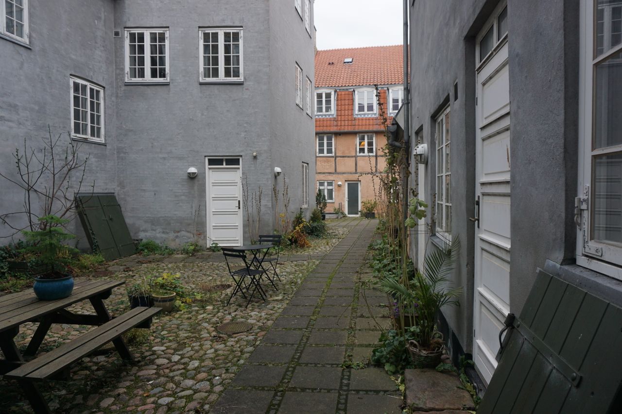 - Bagudgang til en smuk gård med buske og træer – ideelt til pauseområder eller udendørs aktiviteter